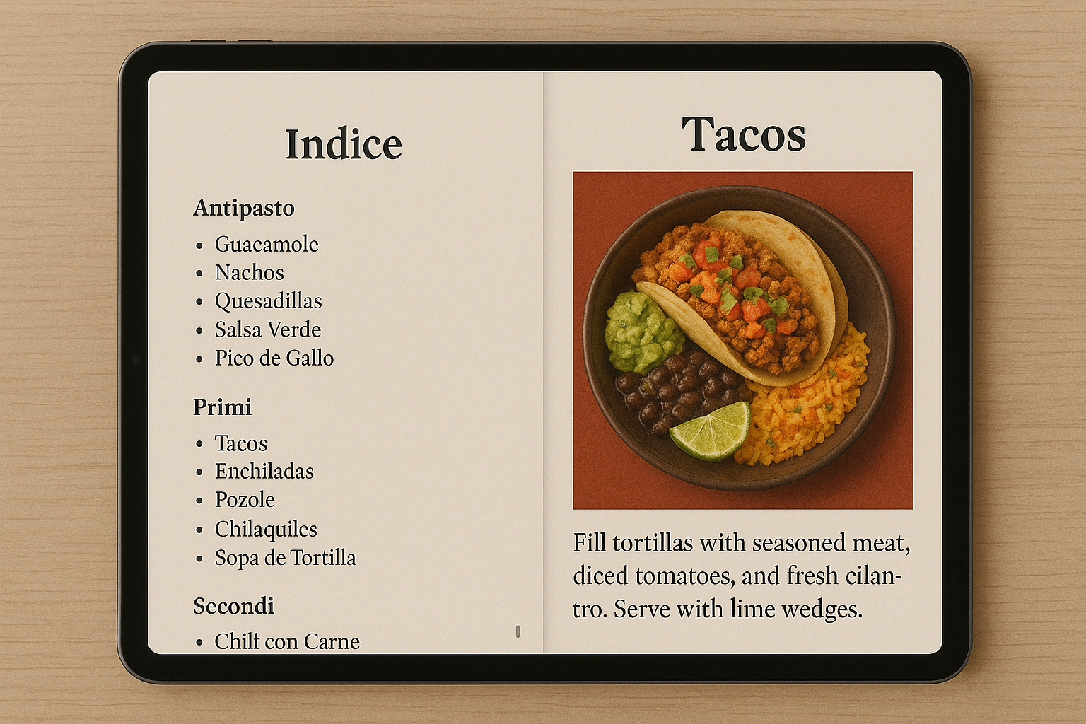 Questo eBook digitale raccoglie una selezione di ricette ispirate alla cucina tradizionale messicana, presentate in maniera semplice e accessibile. Al suo interno troverai piatti tipici spiegati passo dopo passo, con ingredienti facilmente reperibili e procedure chiare, ideali per ricreare sapori intensi e colorati direttamente a casa. Il contenuto è adatto a chiunque desideri esplorare la cucina messicana senza difficoltà.